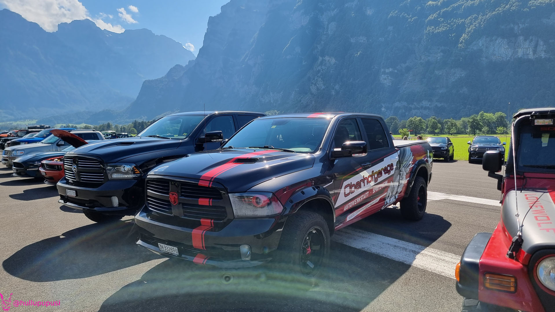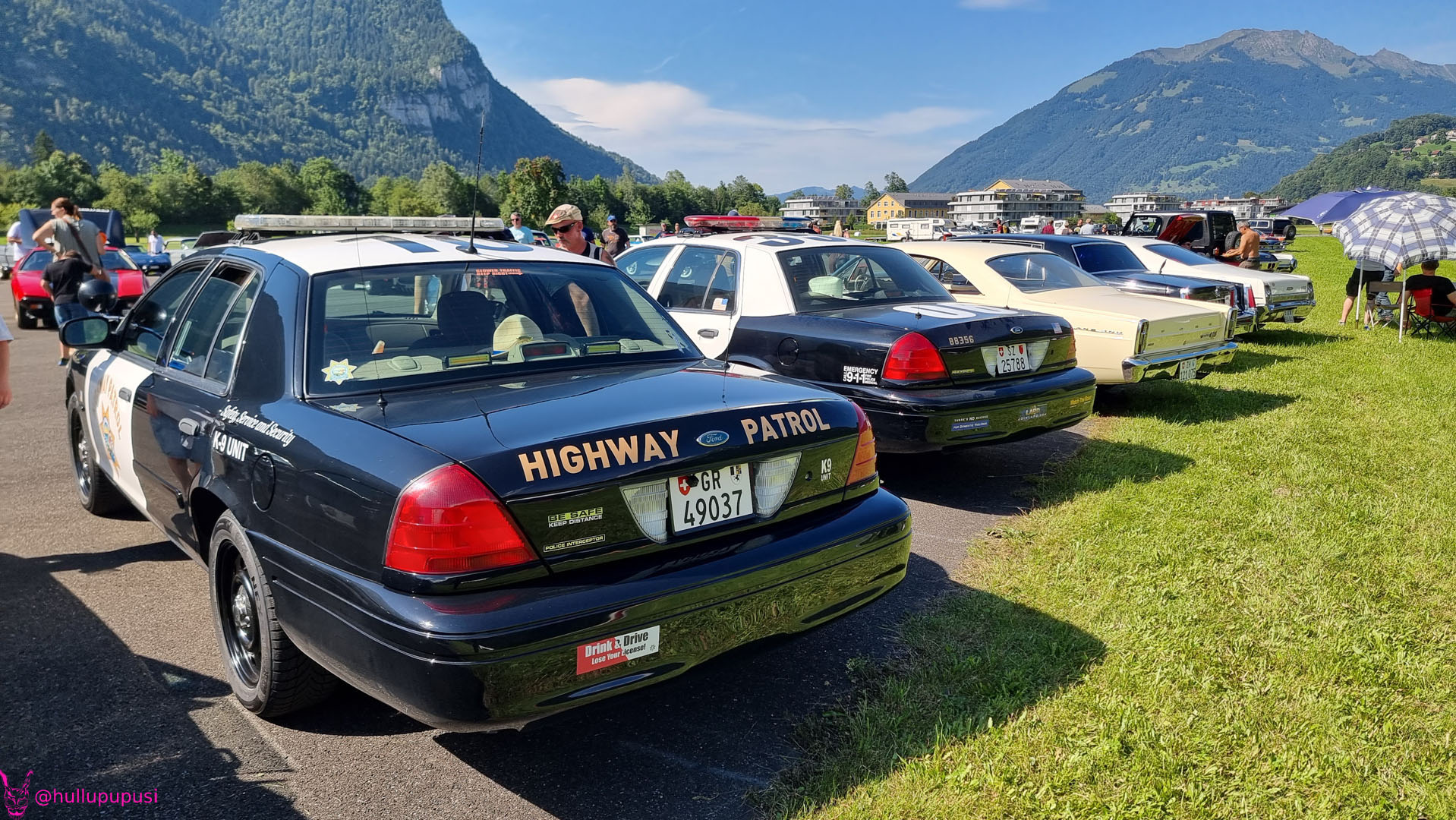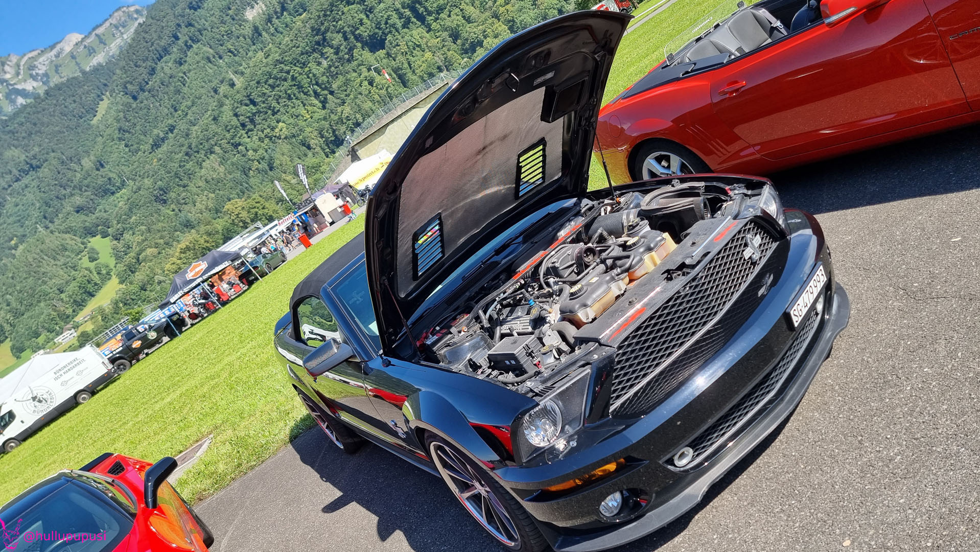 Nach dem zahlen geht es endlich zu den ausgestellten Objekten. Alles Autos, deren Besitzer sich die Mühe und Zeit genommen haben um nach Mollis zu kommen und ihre Prachtstücke zur Schau zu stellen. Autos kommen an während Andere das Gelände bereits verlassen; ich dachte es seien mehr.