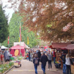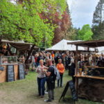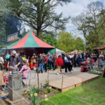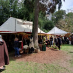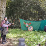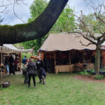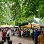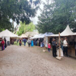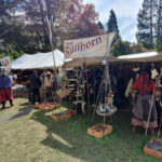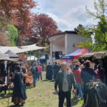 Im kleinen Park vor der Orangerie steht noch eine dritte Bühne. Die ist aber so klein, dass knapp 4 Personen Platz haben. Aber auch da gibt es lecker Brot- und Fleischspiesse. Im kleinen Wäldchen stehen dann noch einige Verkaufsstände mit interessanten Artikeln wie Fellen, Leder, Eisenwaren und Messer. Ein Gewürzhändler ist auch dabei. Der hat neben verschiedenen Pfeffersorten auch noch Samen für violette Frühlingszwiebeln, und andere ältere Gemüsesorten. Das überzeugt mich und kaufe verschiedene Päckchen für meinen Garten.