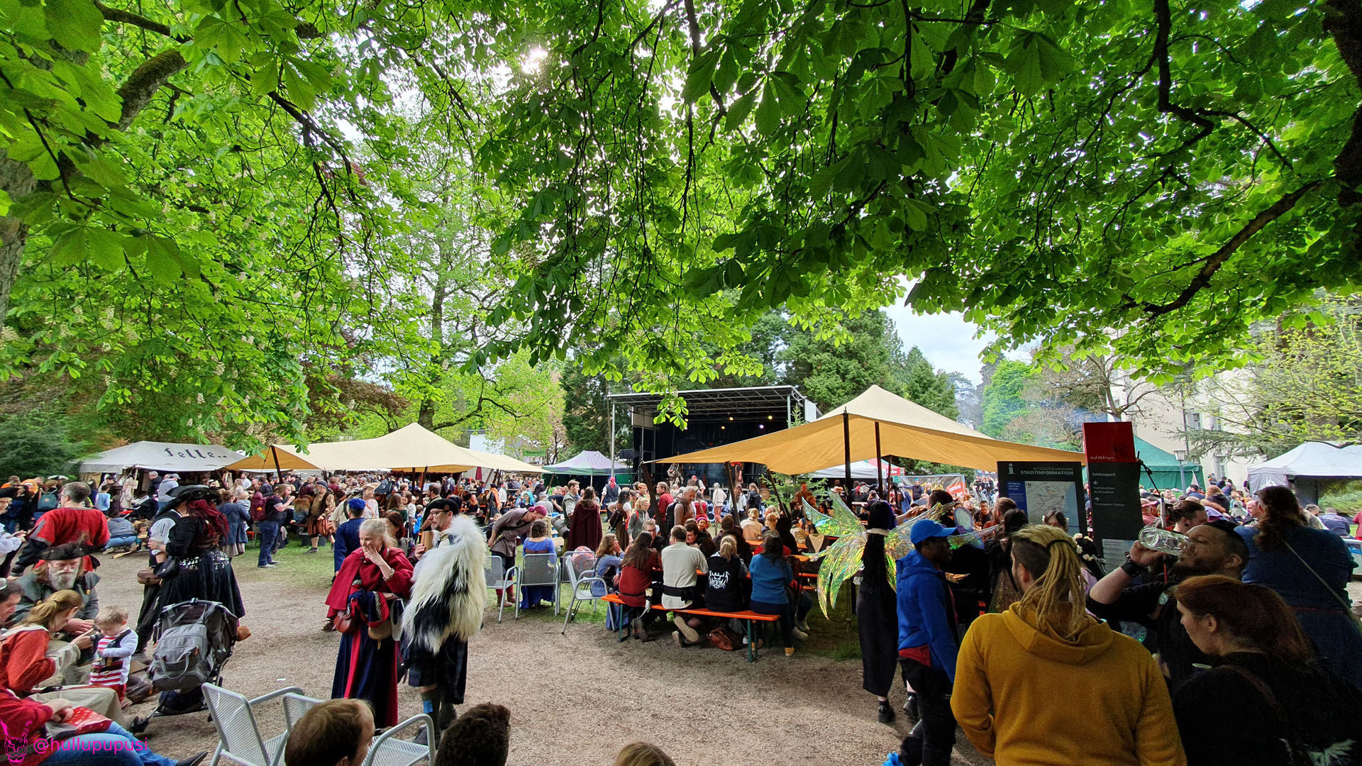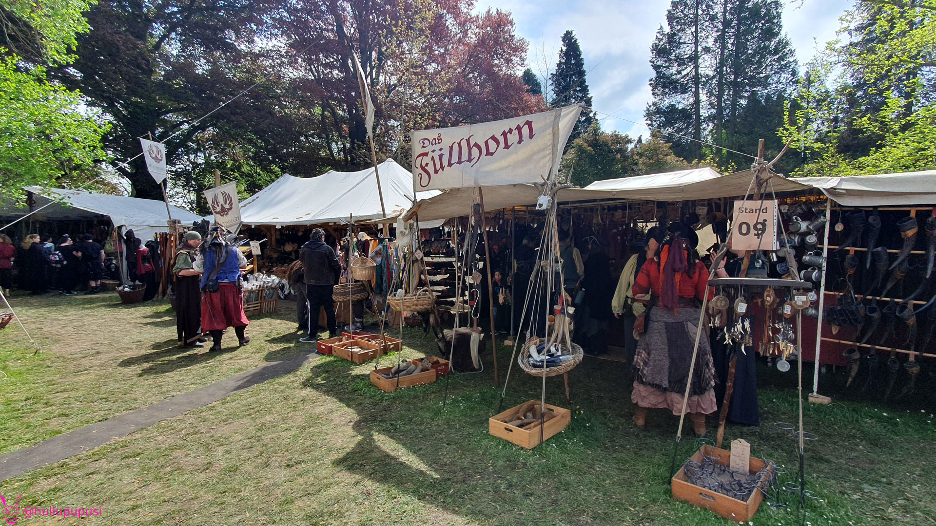 Im kleinen Park vor der Orangerie steht noch eine dritte Bühne. Die ist aber so klein, dass knapp 4 Personen Platz haben. Aber auch da gibt es lecker Brot- und Fleischspiesse. Im kleinen Wäldchen stehen dann noch einige Verkaufsstände mit interessanten Artikeln wie Fellen, Leder, Eisenwaren und Messer. Ein Gewürzhändler ist auch dabei. Der hat neben verschiedenen Pfeffersorten auch noch Samen für violette Frühlingszwiebeln, und andere ältere Gemüsesorten. Das überzeugt mich und kaufe verschiedene Päckchen für meinen Garten.