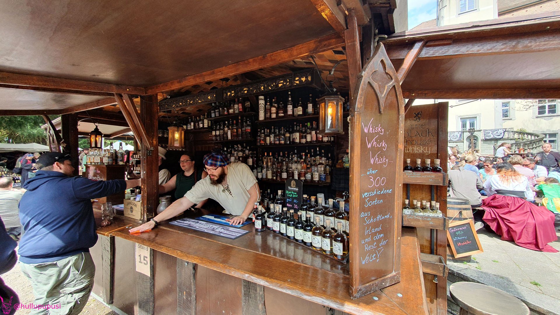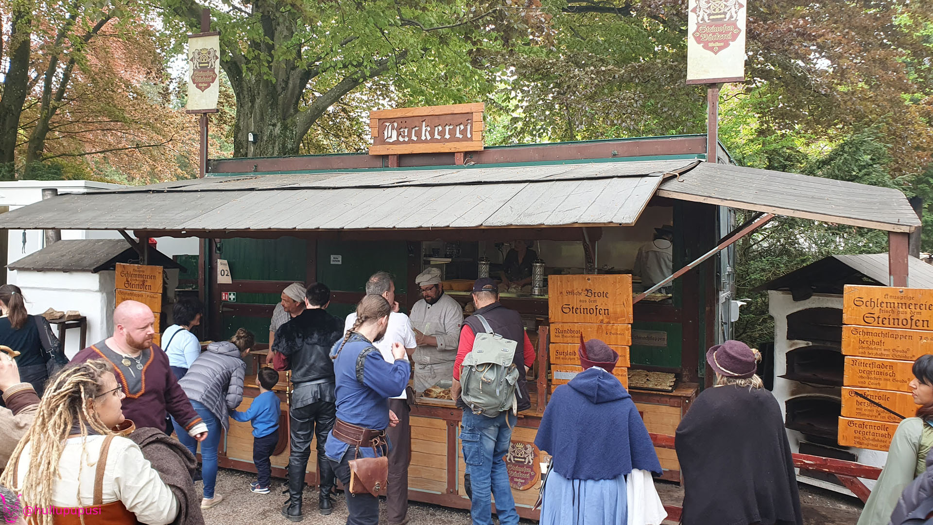 Auf einer anderen, noch kleineren Bühne spielt eine andere Band. Beim Diebsturm gibt es Getränke und der Bäcker, der in den Holzöfen Brote und Snacks backt. Die sehen sehr lecker aus. Toiletten gibt es auch, aber dafür muss schon wieder bezahlt werden; der Eintrittspreis war nicht genug um kostenlose Toiletten zur Verfügung zu stellen.